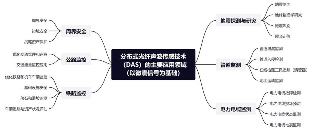 基于光纖的分布式聲波傳感器(DAS)是一種利用光纖中的后向瑞利散射(RBS)來定位和恢復光纖鏈路上的任意位置處機械振動信息(振幅、相位和頻率)的技術(shù) 。由于機械振動通常能夠在介質(zhì)中傳播很遠,DAS 能夠檢測遠離光纖的事件;基于光纖的低損耗特性,傳感光纖的長度可達數(shù)千米至上百千米,因此 DAS 系統(tǒng)的探測覆蓋范圍非常廣;DAS 的振動檢測帶寬可高達數(shù)十千赫茲,可以包含待測事件的豐富信息 ;傳感光纜具有本征安全、抗電磁干擾、耐惡劣環(huán)境等優(yōu)勢。這些優(yōu)點使得 DAS 在周界圍欄安防、管道安全監(jiān)測、井下資源勘探等長距離應用領(lǐng)域中有著巨大的應用潛力,并且其應用領(lǐng)域仍在不斷拓展中。